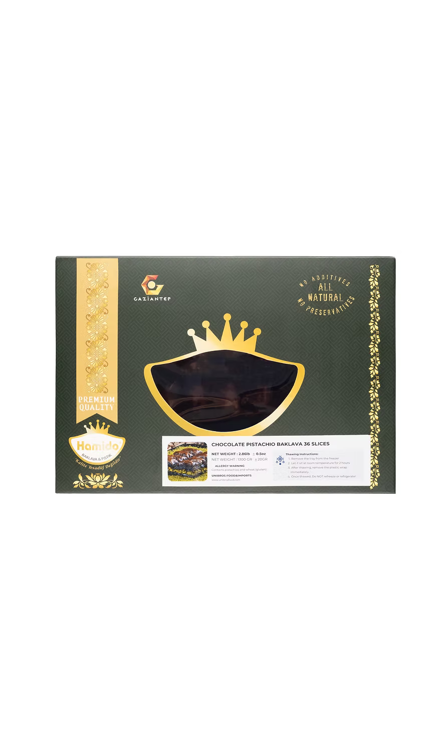 Experience the timeless taste of classic baklava, elevated with a premium cocoa powder and Flaky filo dough layered with pistachios is bathed in our fragrant syrup, then finished with a touch of chocolatey indulgence.